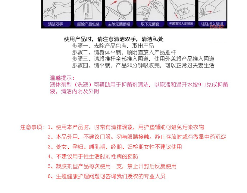使用方法:凝胶剂型:以原液注入女性阴道内或取原液适量直接涂抹于男女外阴表面。建议正常情况下每天使用一支。