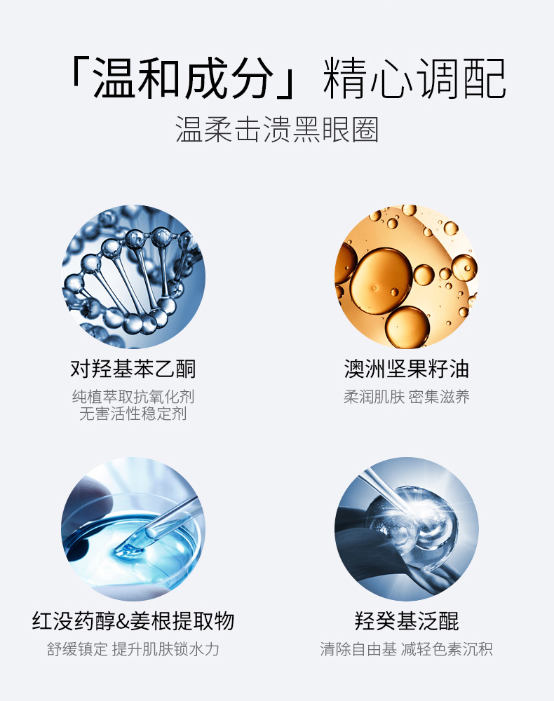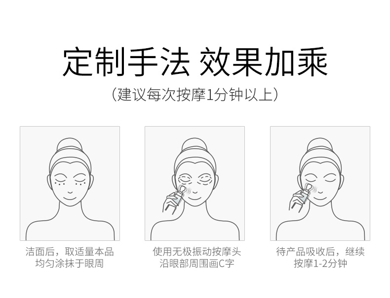 使用方法:早晚清洁润肤后,按压软管挤出适量于合金按摩头上;点涂按摩上下眼周肌肤,待产品吸收,继续微震按摩1-2分钟,提亮眼周肌肤,缓解眼部倦怠。