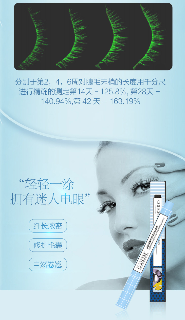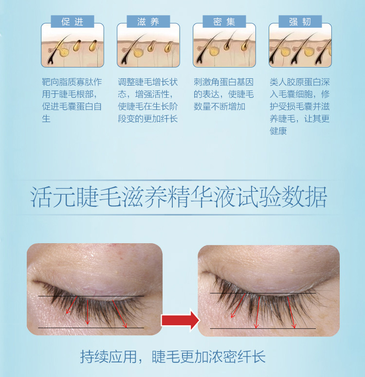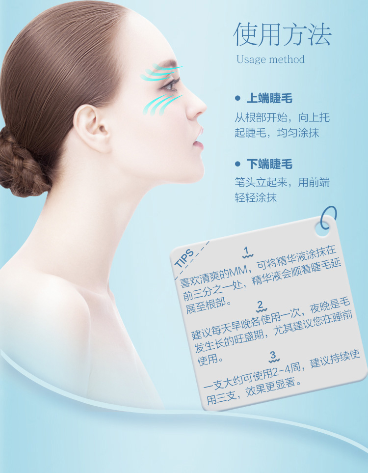 使用方法:洁肤后,拭干水分,保持眼部清洁,用毛刷沾取适量本品,轻轻涂抹于睫毛根部。涂下睫毛时,沿着下睫毛生长方向,从根部开始涂抹即可。早晚各涂一次。