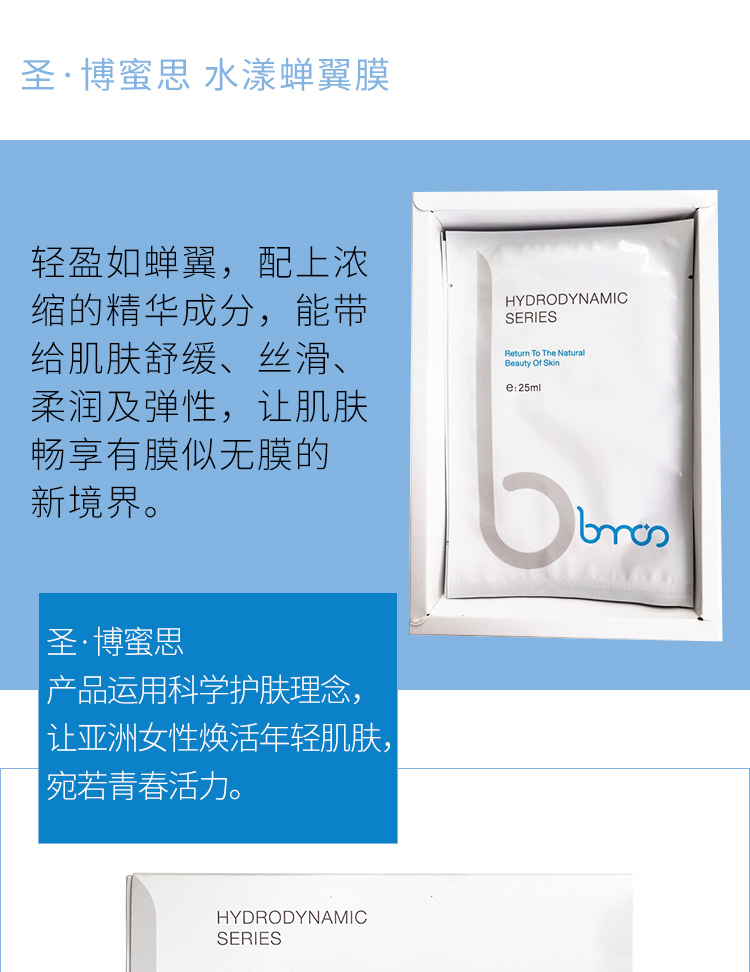作用:轻盈如蝉翼,配上浓缩的精华成分,能带给肌肤舒缓、丝滑、柔润及弹性,让肌肤畅享有膜似无膜的新境界。