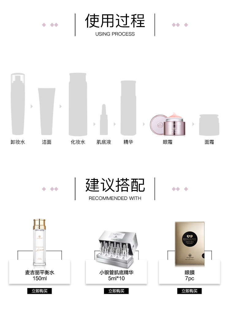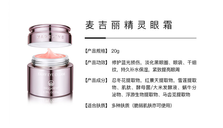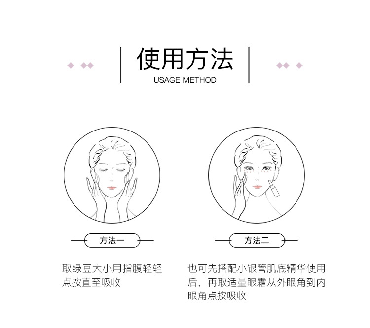 使用方法:早晚洁面后于爽肤水后,取绿豆大小用指腹轻轻拍打按摩眼周。