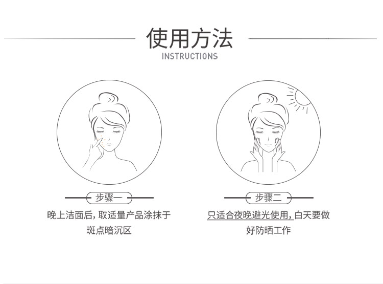 使用方法:晚上洁面护肤后,请取适量本品于指间或掌心温热乳化,均匀地轻拍于洁净干爽的面部,暗沉区域请重点涂抹。