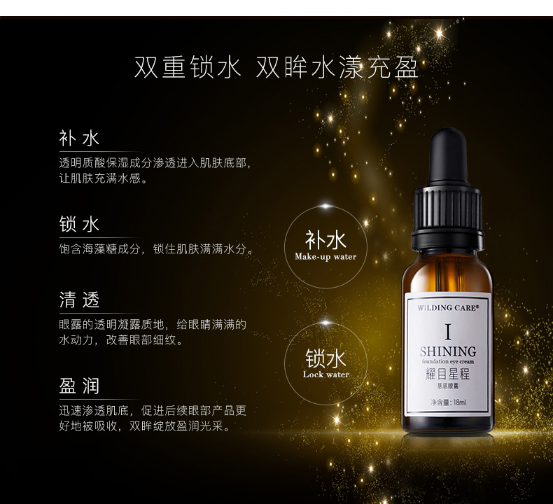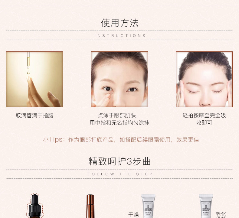 使用方法:取滴管滴于指腹,点涂于眼部肌肤,用中指和无名指均匀涂抹,轻拍按摩至完全吸收即可。作为眼部打底产品,如搭配后续眼霜使用,效果更佳。
