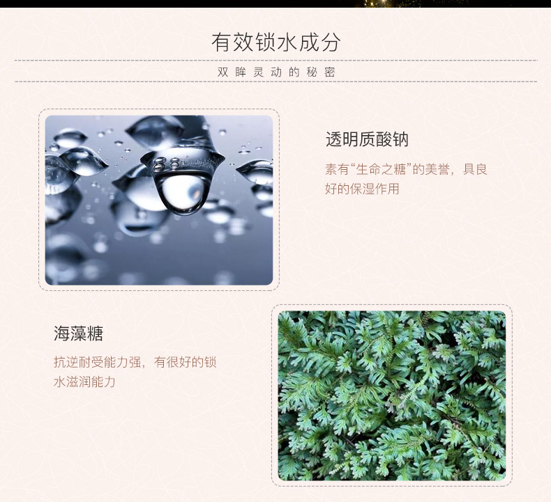 作用:透明凝露质地,清透易吸收,为眼周肌肤补充充足水分,促进后续眼部产品更好地被吸收。透明质酸钠成分添加,令双眸绽放水漾光采。