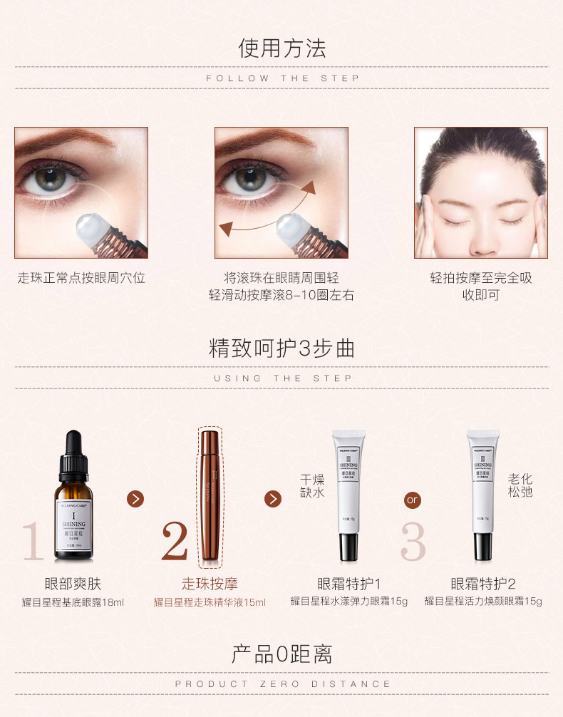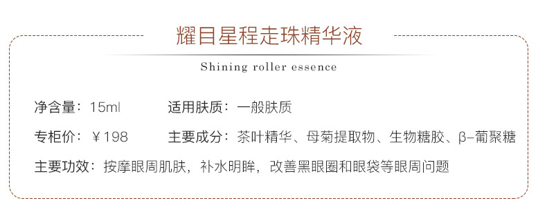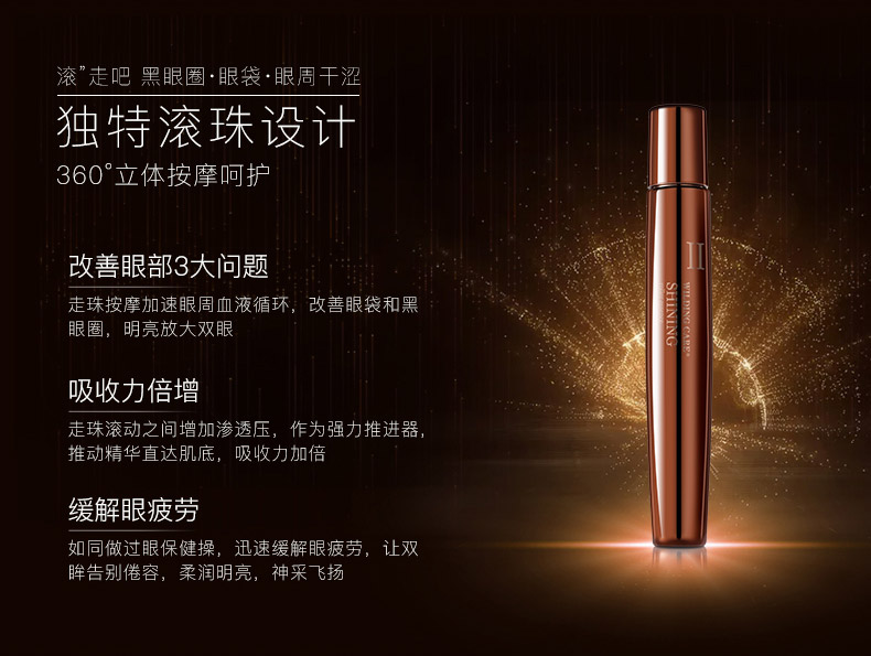 作用:灵巧走珠设计,轻柔按摩眼周肌肤,促进精华成分吸收,补充眼周肌肤所需水分,让双眸柔润明亮,神采飞扬。