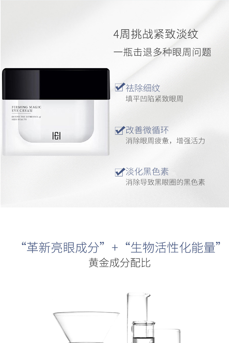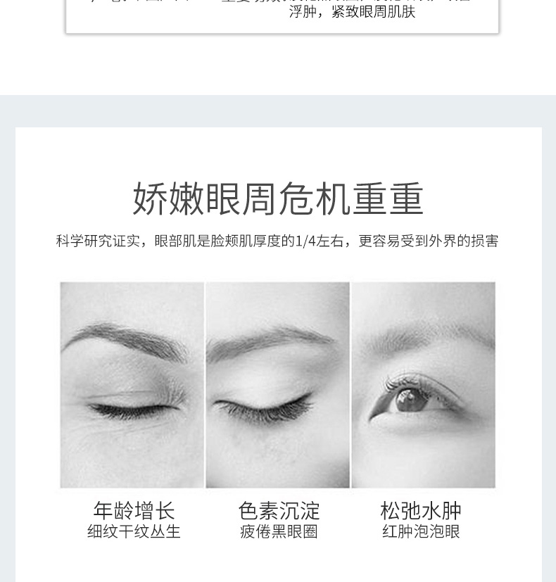 作用:细腻的霜体质感,舒润柔滑,淡化眼周细纹,改善眼部粗糙,紧致眼周肌肤,令眼周肌肤水润嫩滑。