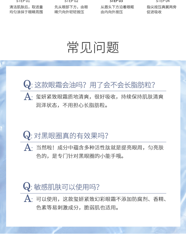 使用方法:取适量本品均匀涂于眼周轻轻按摩至吸收即可。