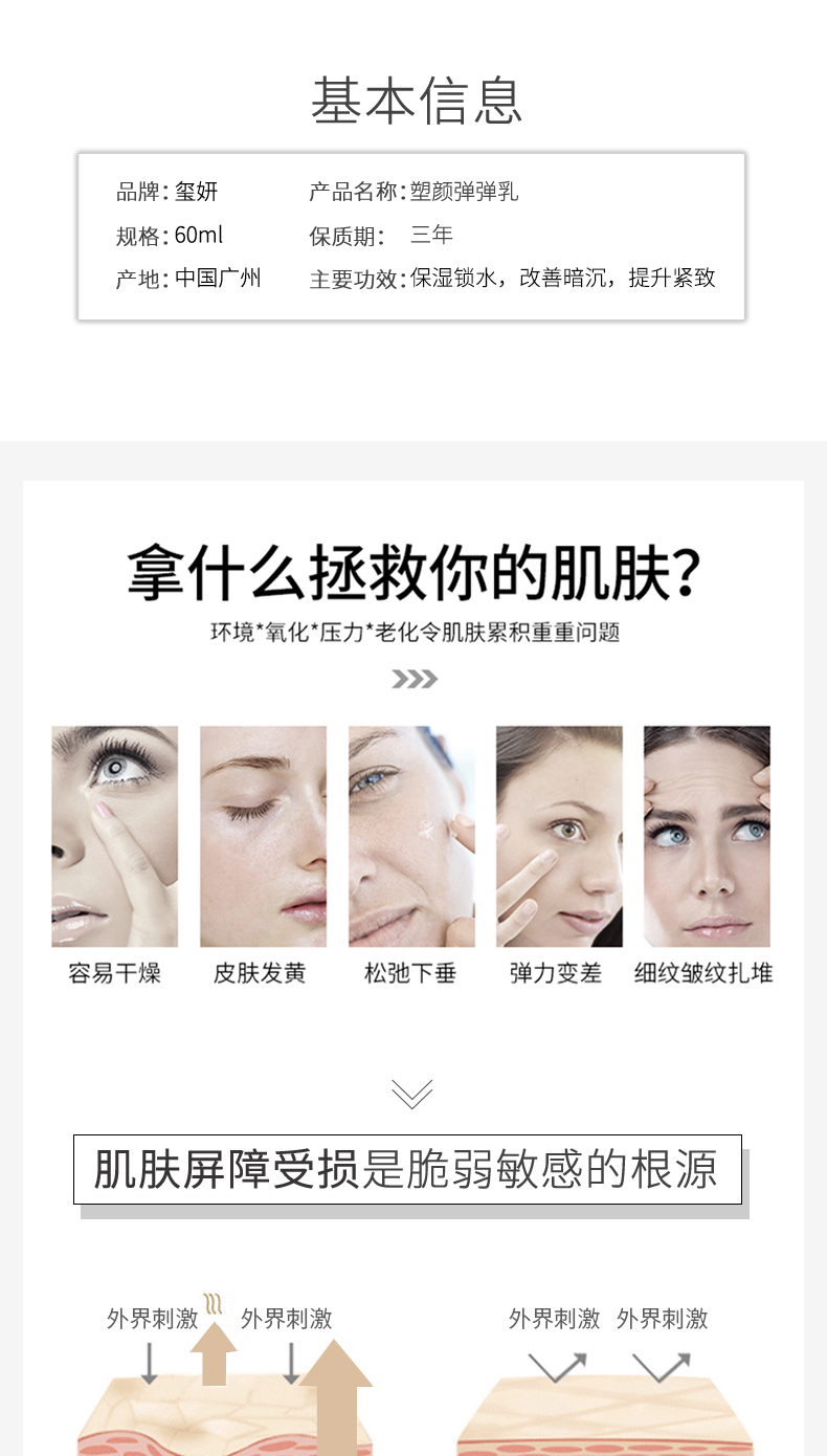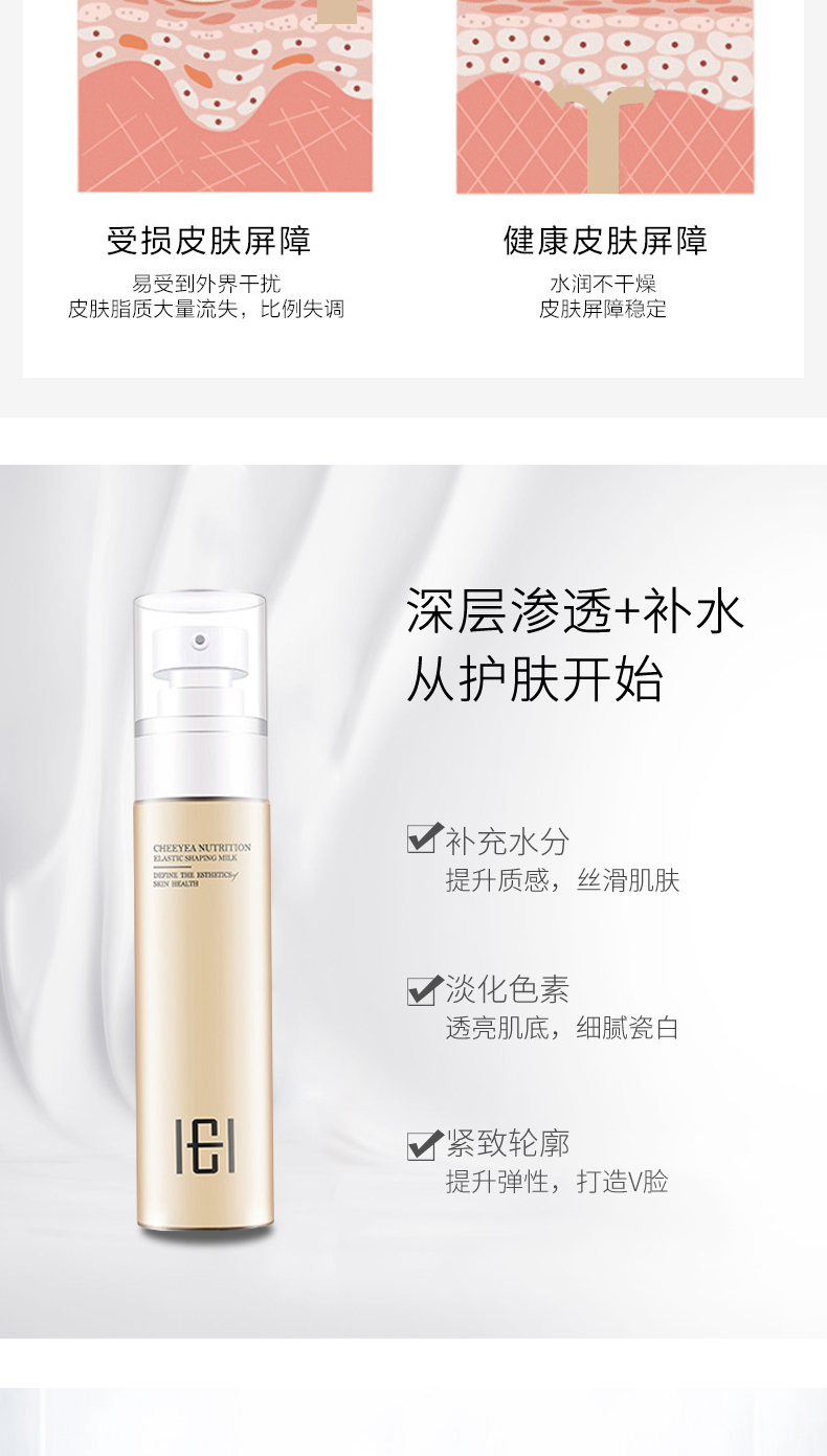 作用:本品蕴含丰富的弹性蛋白,补充肌肤水分及养分,同时添加葡萄籽提取物等,焕活肌肤,使肌肤饱满富有弹性,定格年轻光彩。