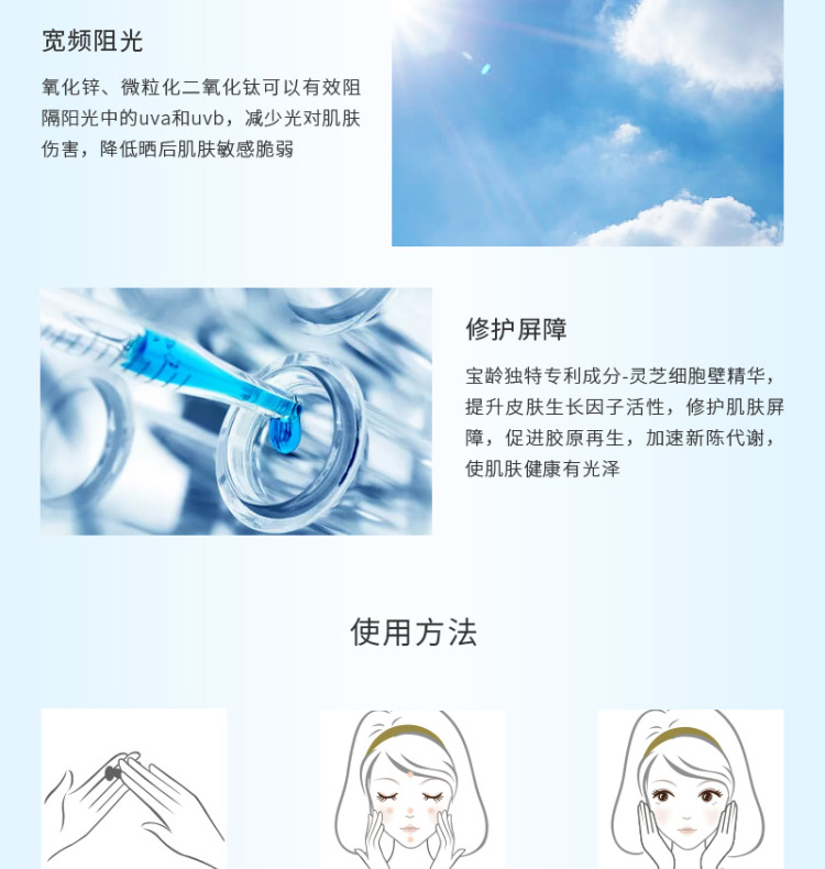 使用方法:取适量平均涂抹于脸部及其他需防护部位肌肤。