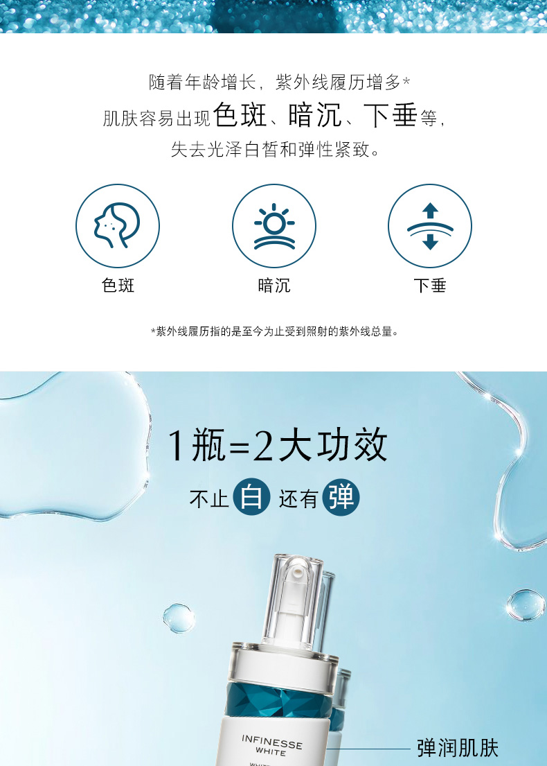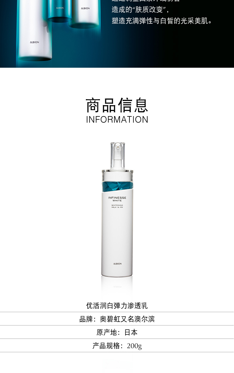 作用:修补每个角质细胞,给予肌肤紧致张力和柔软弹力,一款使肌肤明显白皙的美白乳液。